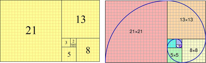 ۰، ۱، ۱، ۲، ۳، ۵، ۸، ۱۳، ۲۱،.... طبق این اعداد کادر مستطیل به این صورت تقسیم میشوند